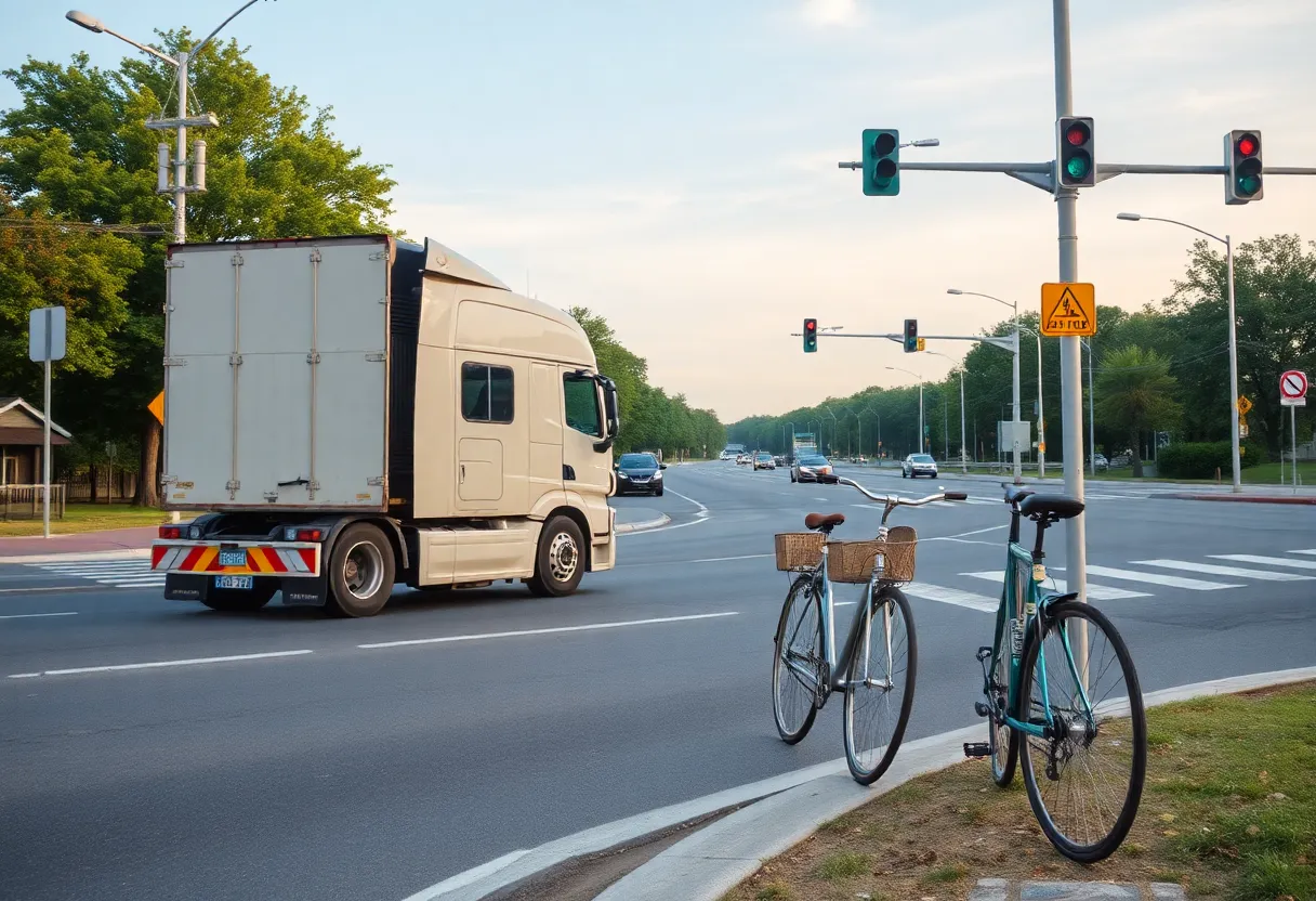 Intersection in Charlotte showing a semi-truck and bicycle, highlighting road safety issues.