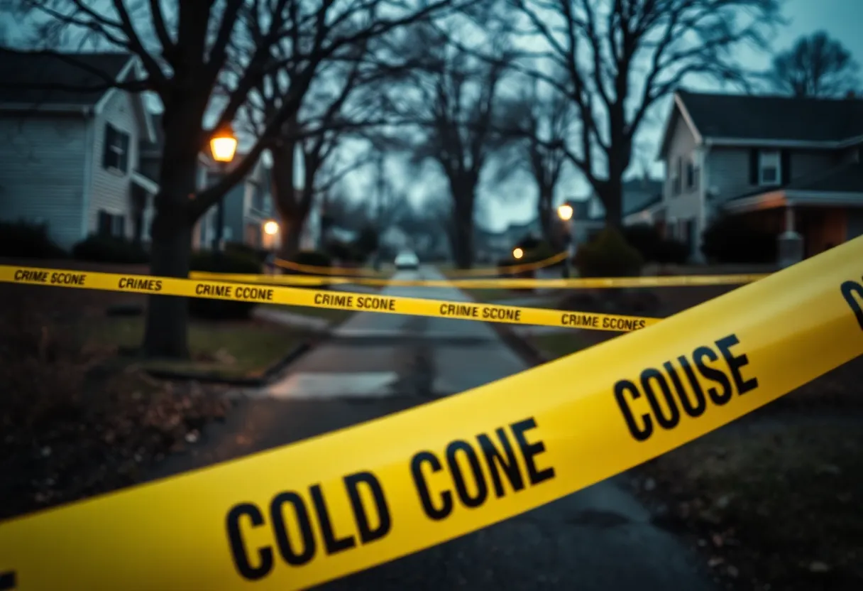 A suburban neighborhood crime scene with forensics evidence and crime scene tape.